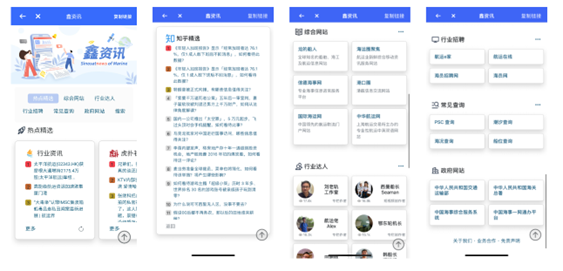 “鑫資訊”定位于為用戶提供面向海洋行業的一站式綜合信息導航服務,不僅每日精選涵蓋航運、海事、船舶、產業經濟的行業熱點資訊,同時接入微博、知乎、微信及虎撲等中國主流社交媒體平臺的熱點話題榜,并且還提供了一站式的海洋門戶網站、行業達人專欄、行業達人自媒體、行業招聘信息、實用查詢工具、行業分管部門官網等導航入口。